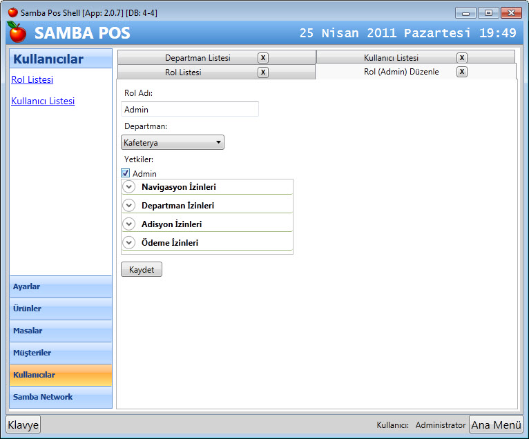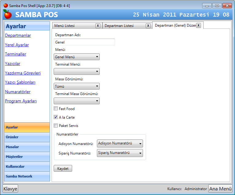 SambaPOS farklı departmanlar tanımlanabilen ve bu departmanlara farklı menüler tanımlanabilen bir programdır. Şimdi bu tanımlamayı biraz açalım.