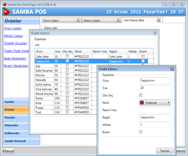 Ek olarak “Ürün özelliklerini düzenle” komutu ile düğmelere farklı renkler verebiliriz. Ben sıcakları kırmızı, soğukları yeşil, aperatifleri ise mavi renk yapacağım. Bu işlemi basitçe “Detay” ekranından istediğim rengi seçip sonra rengin kodunu diğer satırlara kopyalayarak yapabilirim.
