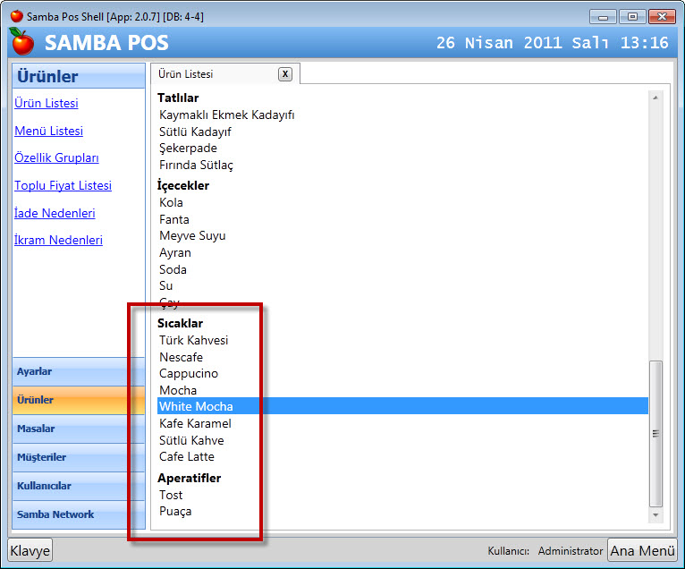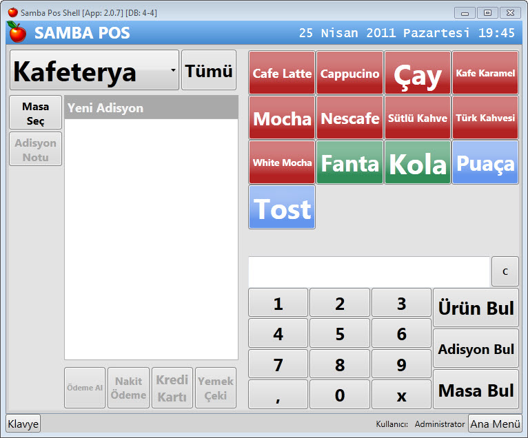 Örnek menüde tek kategori tanımladığımız için SambaPOS bize kategori düğmelerini göstermiyor. Kafeterya'da kullanılacak ekranımız kullanıma hazır. Dilerseniz Yönetim ekranında Kullanıcılar > Rol listesi sayfasından admin rolüne tıklayıp Departman seçeneğini “Kafeterya” olarak değiştirebilirsiniz. Bu durumda admin kullanıcılarından herbiri POS ekranına geldiğinde direk olarak “Kafeterya” departmanına geçiş yapmış olurlar.