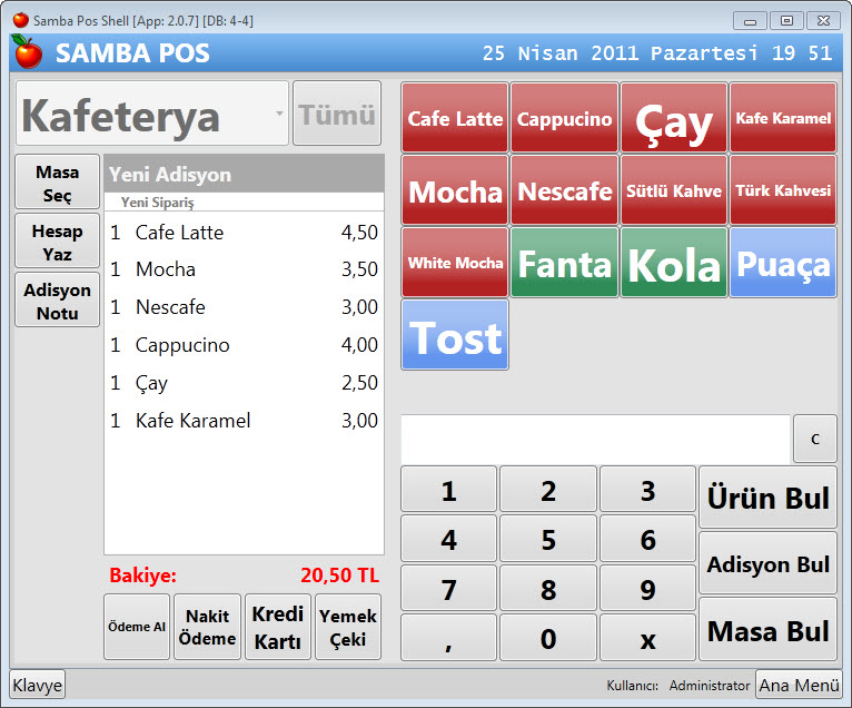 Kafeterya departmanın tipini Fast Food seçtiğimiz için bu departmanda çalışırken masa görünümü karşımıza otomatik olarak gelmez ve adisyonları hızlıca kapatabilmemiz için altta hızlı ödeme alma butonları görüntülenir. Departman Fast Food bile olsa gerektiğinde masa seç düğmesine tıklayarak adisyonu bir masaya taşıyabilmek de mümkündür. Departman bazlı çalışma sistemi sayesinde Alakart restoranımızda kebaplarımız, pidelerimiz olduğu halde kafeteryamızda sadece o bölüm ile ilgili ürünleri görüntüleyebilmek mümkün olabildi.