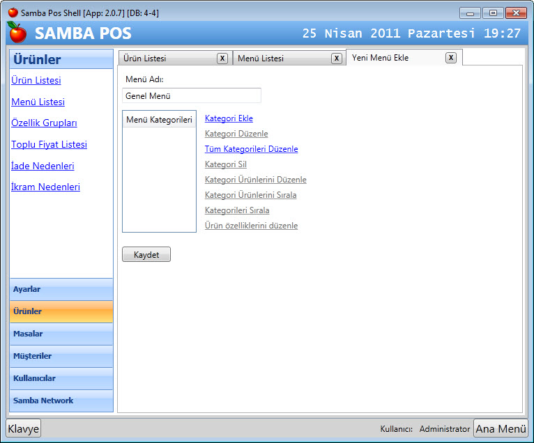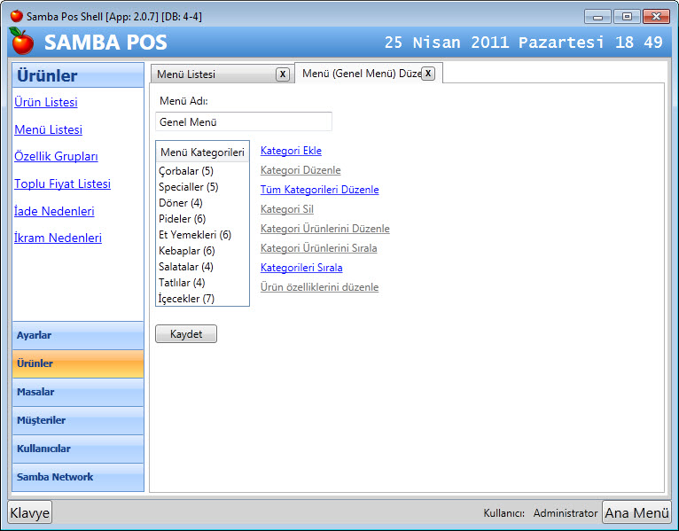 Programı ilk yüklediğimizde örnek olarak “Genel Menü” adında bir menü açılmaktadır. Menü kategorileri POS ekranında gördüğümüz turuncu kategori butonlarıdır. Bu kategori butonlarının altına gelen yeşil ürün butonları ise kategoriler altında tanımlanır. Bu sayfada ayarlamaları ayar linklerlerine tıklayarak yaparız.