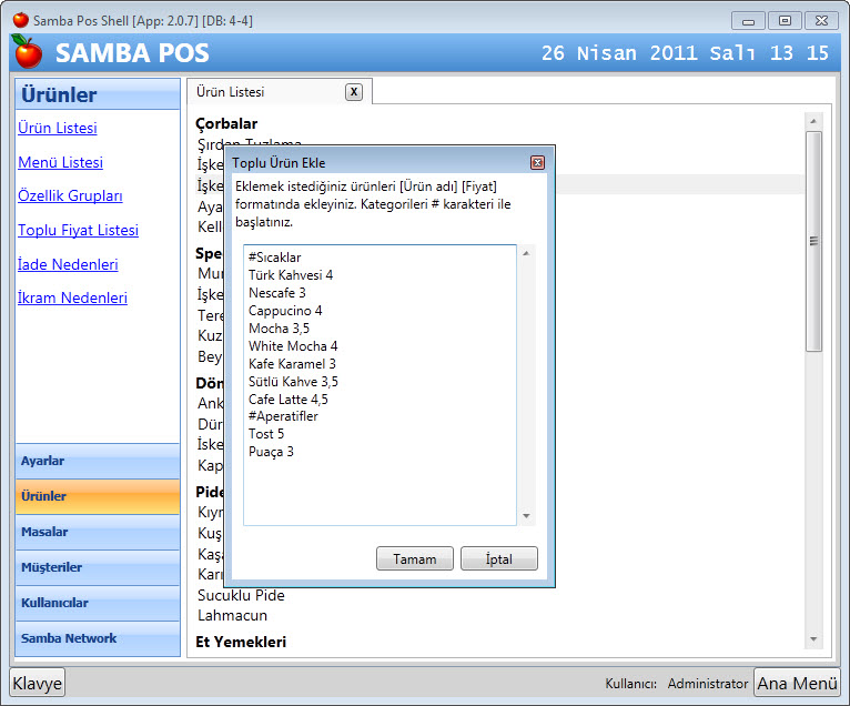 Toplu ürün ekleme ekranı basitçe ürün tanımlamak için kullandığımız ekrandır. Buraya [Ürün Adı] [Fiyat] formatında her satıra bir ürün gelecek şekilde ürünleri yazıyoruz. Örneğin Türk Kahvesi 4 satırı ürünün fiyatının 4 lira olacağını belirler. Ayrıca # işareti ile başlayan satırlar ürün gruplarını belli etmek için kullanılır. Örnekte #Sıcaklar satırından #Soğuklar satırına kadar olan tüm ürünlerin ürün grubu “Sıcaklar” olacaktır. Tamam diyerek ürünleri açıyoruz.