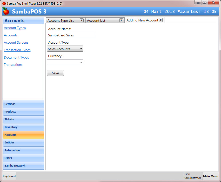 SambaPOS Navigasyon ekranında Yönetim Sekmesinin içerisinde Ayarlar Alt sekmesinde bulur.