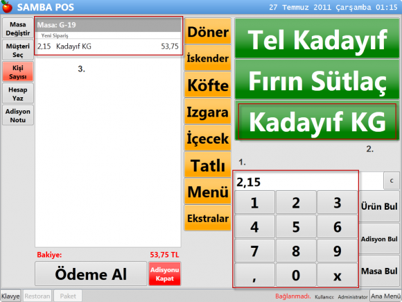 Örneğin 750 gram Kadayıf satabilmek için Numaratörden 0,75 yazı daha sonra Kadayıf a tıklarsak SambaPOS adisyona 750 gram Kadayıf ekler.