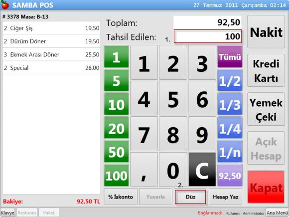 Bunun için Adisyonun içine girerek Numartörden 100 yazıp DÜZ tuşuna basmamız yeterli.