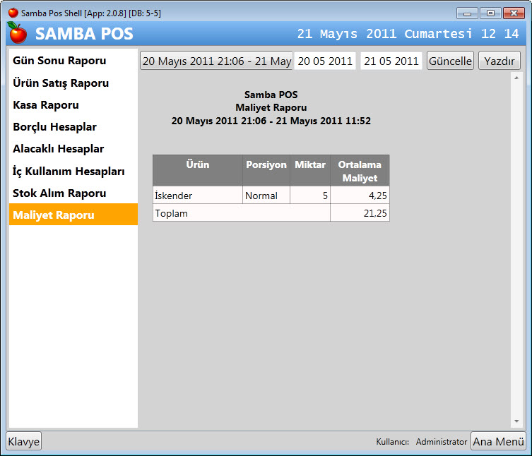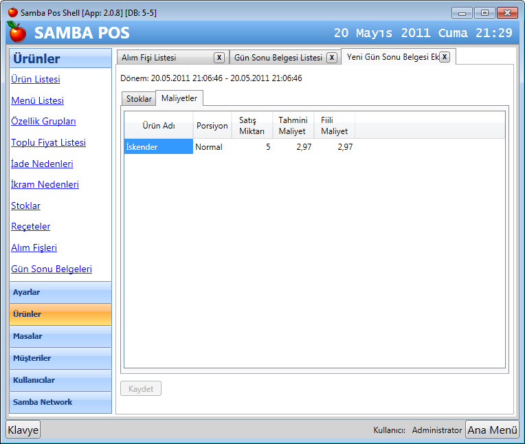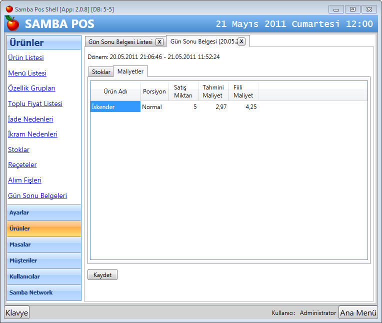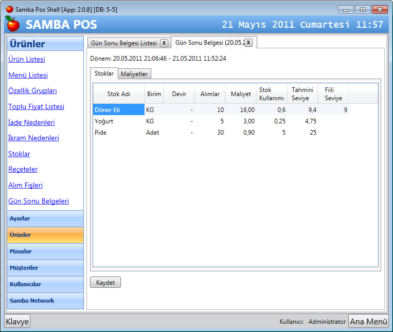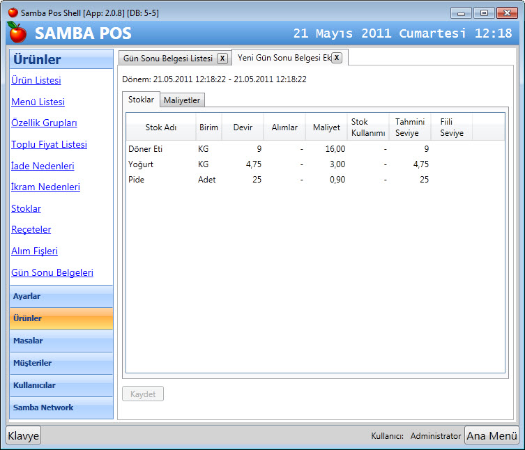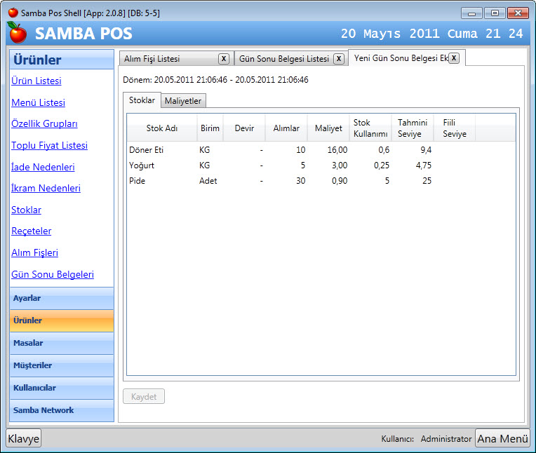 Aslında stok ve maliyet takibi için stok kartlarını ve reçeteleri tanımlamak dışında ekstra bir iş yapmaya gerek kalmıyor. SambaPOS gerekli veriyi otomatik olarak oluşturuyor. Siz sadece sayım yaptığınız zaman oluşan “gün sonu” belgelerine elinizde kalan stokları işliyorsunuz.