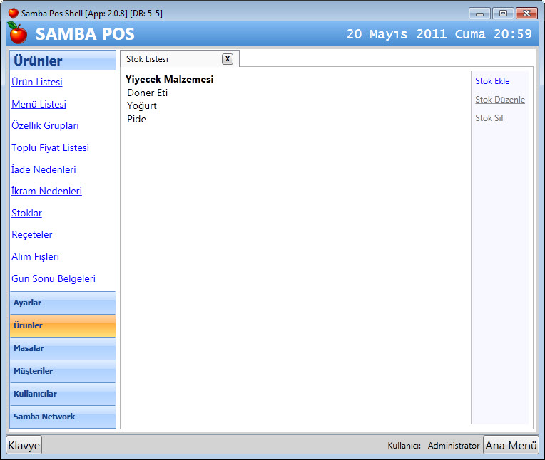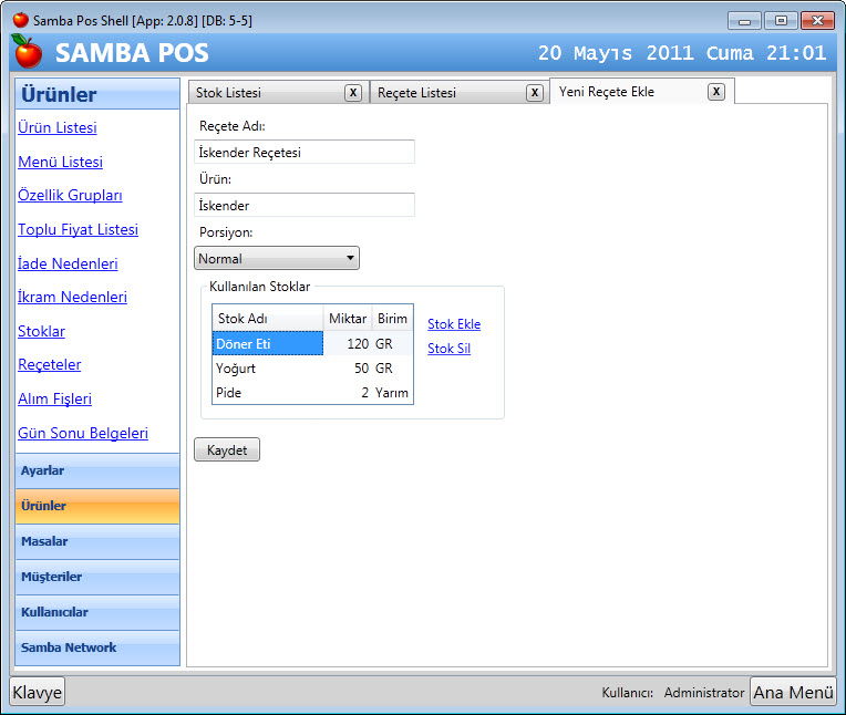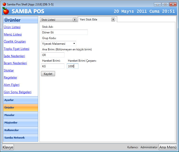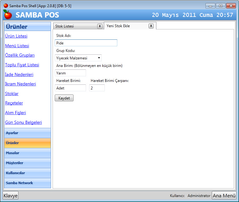 Basit bir örnek ile bunları açıklayalım. Sıfır SambaPOS kurulumu üzerinden örnekleme yapacağım. Önce stok kartlarımızı açacağız.