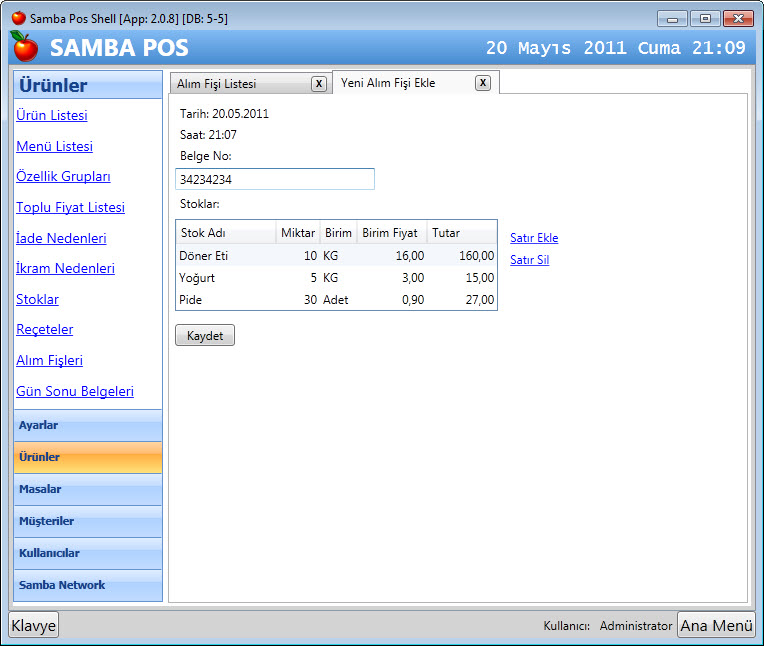 Herhangi bir belge numarası veriyoruz ve giriş yapmak istediğimiz ürünleri “Satır Ekle” komutu ile veya “insert” tuşu ile ekliyoruz. Miktarları ve alış fiyatları yazdıktan sonra “Kaydet” diyerek belgemizi kayıtlara geçiyoruz. Pide satırına dikkat ederseniz Birim “Yarım” değil “Adet” olarak geliyor çünkü Hareket Birimini “Adet” olarak tanımlamıştık.