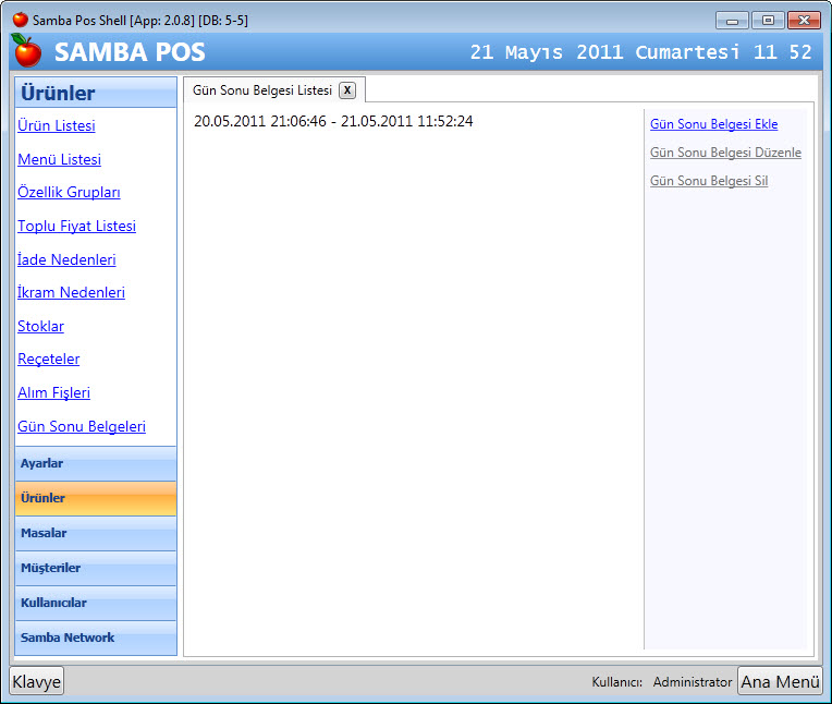 Ürünler > Gün Sonu Belgeleri > Gün Sonu Belgesi Ekle komutu ile bir gün sonu belgesi oluşturalım.