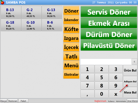 Bunun için SambaPOS da Pos ekranında Büyük Numaratörden Adisyon Bul tuşuna 1 kere tıklanır.