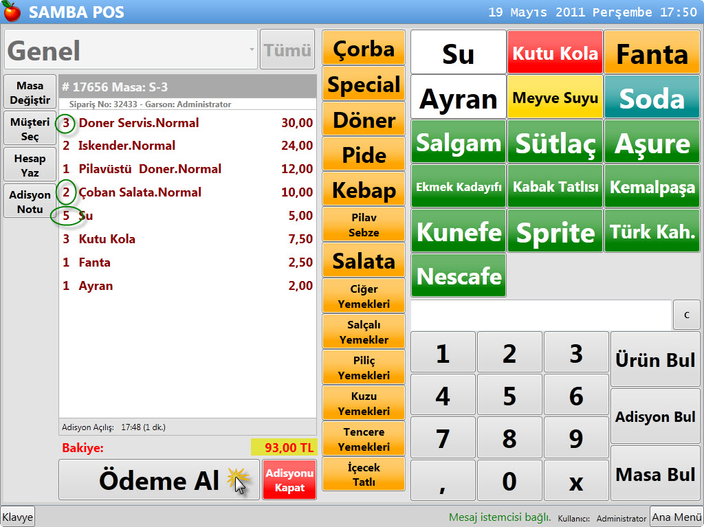 Buradan sonra ödeme tipini, ödeme miktarı ile seçerek işlemimizi tamamlar ve kaldığımız yerden adisyon kapanana kadar aynı işlemleri tekrarlayabilir.