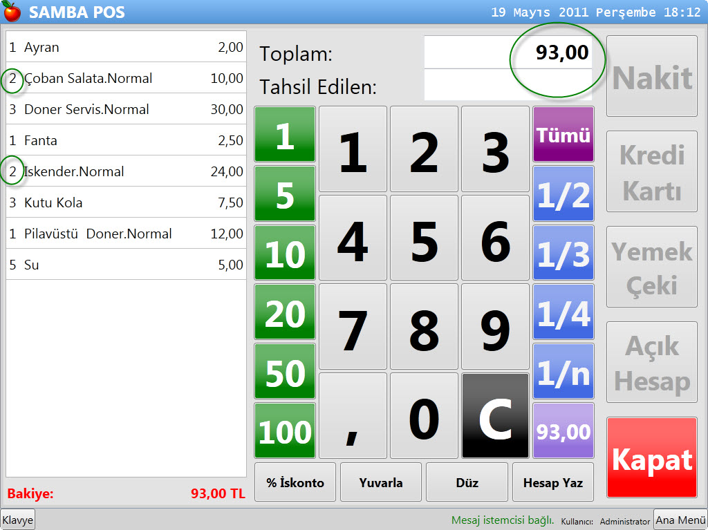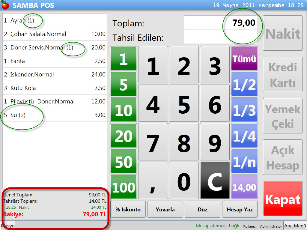 Yukarıdaki resimden de anlayacabileceğiniz gibi Masanın toplam 93 TL olan borcundan 14 TL tahsil edildi ve bu tahsilat dip toplamı değiştirdi.