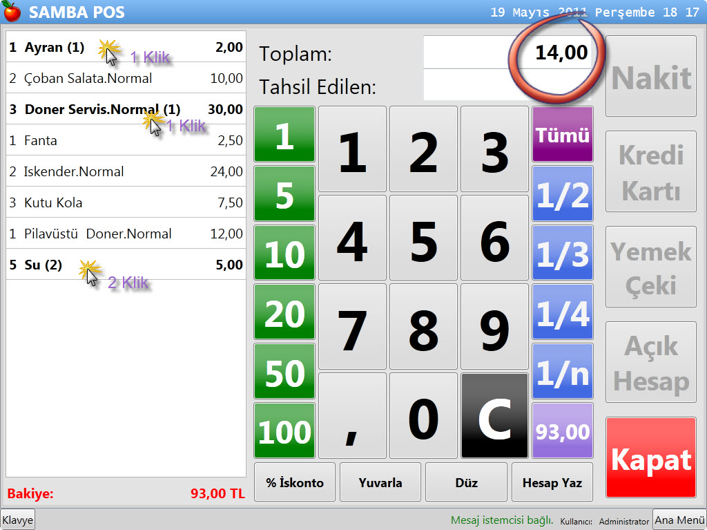 Bu şekilde ödeme alırken bile ödeme tiplerinin farklı farklı seçebilirsiniz. Örneğin: Müşteri az evvelki örnek te olan 14 TL nin 4 TL sini Nakit 10 TL sini ise Kredi Kartından ödemek isteyebilir. Bu durumda ürünleri seçilip Toplam hanesi 14 olduktan sonra alttaki numaratör kullanılarak ödemek istediği miktar tuşlanır ve ödeme tipi seçilerek teker teker ödeme de her bir ödemeninde ödeme tiplerini farklı vermiş olabilirsiniz.