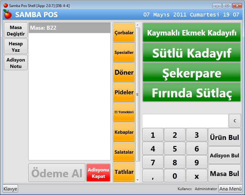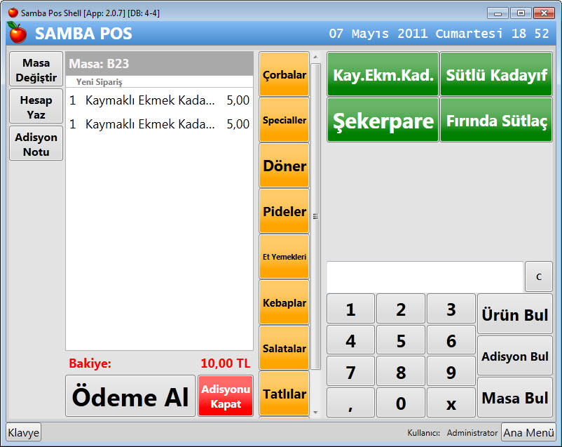 Örnekte göründüğü gibi ürün düğmede Kay.Ekm.Kad. olarak görünüyor ancak üzerine tıkladığımızda adisyona Kaymaklı Ekmek Kadayıfı olarak geçiyor