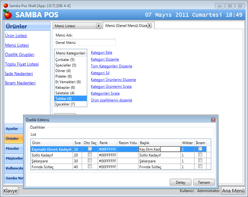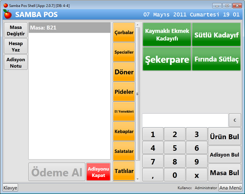 Öncelikle SambaPOS ekran düğmelerinde görünen isimlerin menü açılırken kullanılan isimlerden farklı verilebildiğini söyleyelim. Yani Kaymaklı Ekmek Kadayıfı gibi bir ürünü ekranda Kay.Ekm.Kad. gibi kısaltarak gösterebilmeniz mümkün. Ekranda Kay.Ekm.Kad. gibi görünse de adisyonda ve raporlarda ürün adı yine Kaymaklı Ekmek Kadayıfı olarak görünecektir.
