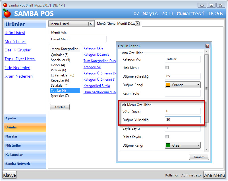 Ürün ismini kaydırıp düğme yüksekliğini yüksetmek de bir çözüm olabilir bunun için Tatlılar kategorisi üzerinde iken Kategori Düzenle komutu veriyoruz. Gelen ekranda Alt menü özellikleri bölümünde Düğme yüksekliğini 80'e çıkarıyoruz. Bu tatlılar kategorisi altındaki tüm düğmelerin büyümesini sağlar.