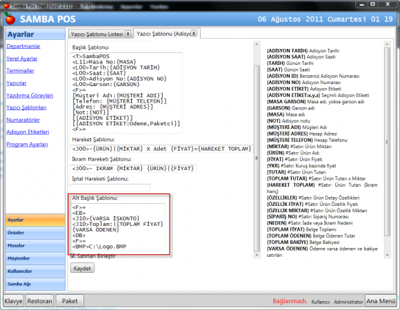 “SambaPOS > Yönetim > Ayarlar > Yazıcı Şablonları”